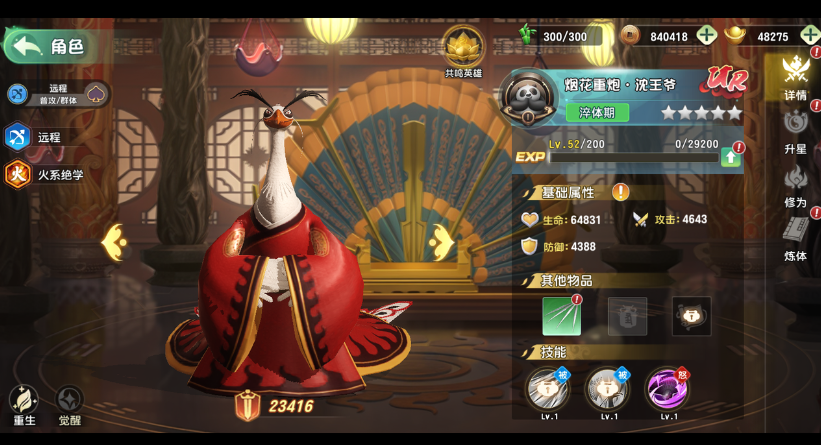 当然了,像这种远程输出型的角色一般都是比较脆皮的,所以沈王爷自然也不例外,因此如果说各位同学想让他战斗到最后的话,在上场之后一定要再额外给他配一个治疗型的角色,比如说快螳螂就是不错的选择,而且这个角色也很容易获得。你也可以通过集齐三个同样角色,然后升星的方式来提升它的各项属性,这样不管是生存能力还是攻击力都将会大幅度的提升。