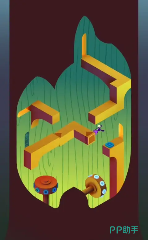 进入到第二道门以后,玩家会进入到第二个房间,在这个房间中依旧需要先踩一下按钮,等着齿轮出现以后,用齿轮来控制大树造型的大门,转转齿轮就可以打开大门,从大门进入可以来到和底部保持对齐处的入口,随后在旋转齿轮将树门给关上,接着从另一侧的出口处走,踩一下第二个按钮就能回到树门内部,使用右边的齿轮将左上角位置的门给打开就可以进入到最顶部的位置了。