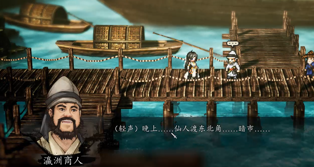 重点是要找瀛洲商人交谈。跟他对话完会触发剧情,然后游戏会让你去客栈找宋掌柜。到了客栈跟宋掌柜说完话,场景会直接切换到晚上的仙人渡。这时候地图右上角有个小屋子,进去之后能看到暗市商人。跟这个商人交易的时候也有特殊对白,不过他卖的那几本秘籍其实没必要买,因为通过其他途径都能拿到。