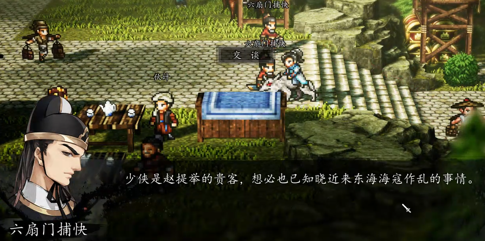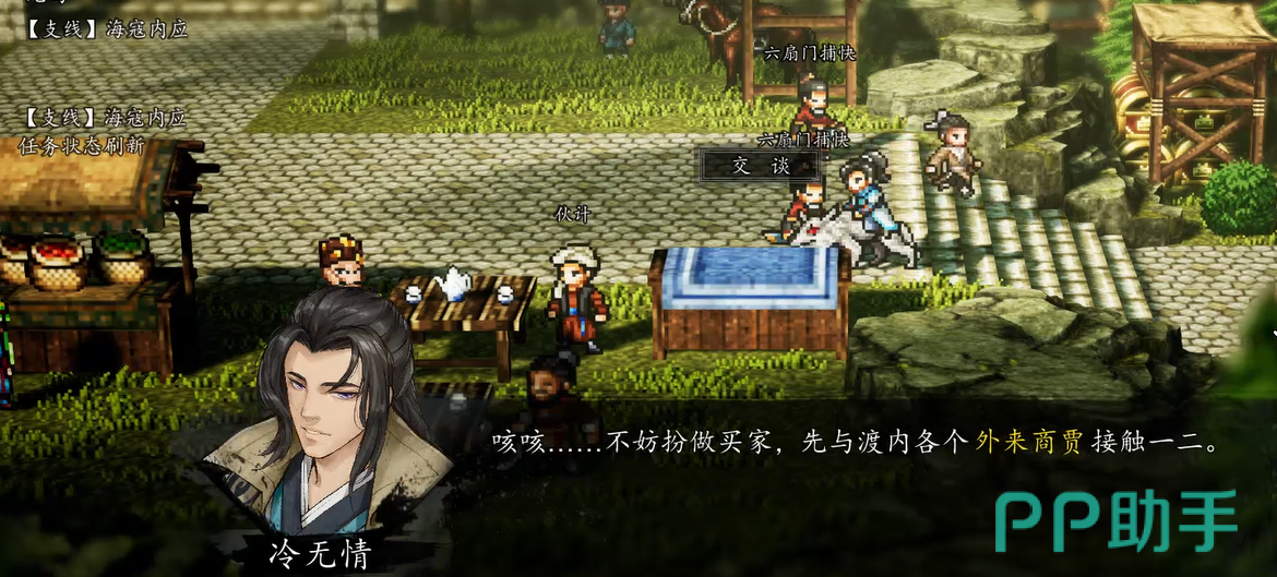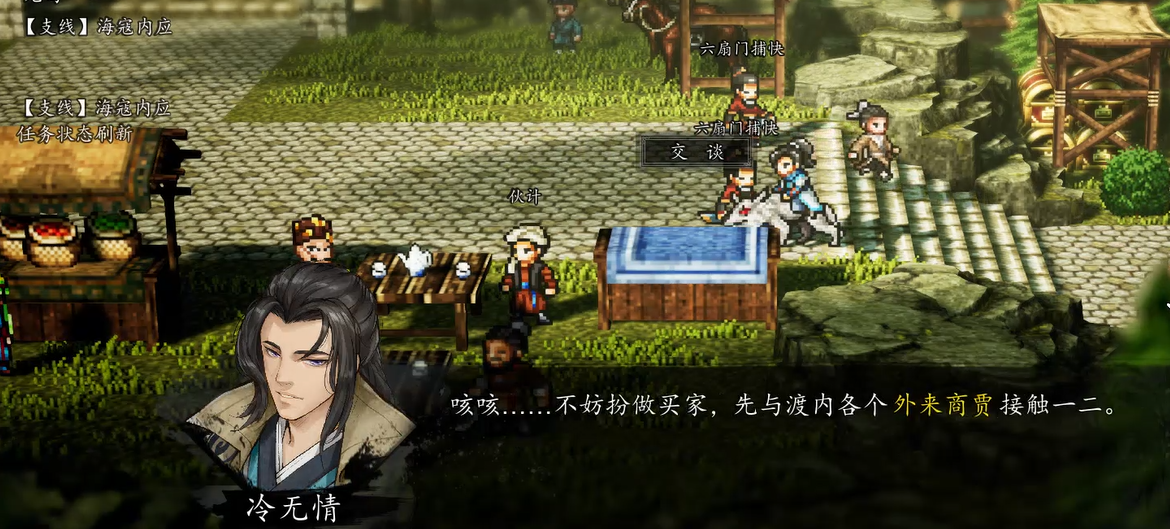 到了仙人渡之后,先往提举司那边走。如果队伍里有冷无情的话,走到门口会直接触发一段对话。看完这段对话继续往里面走几步,又会出现第二段剧情。这时候找六扇门的捕快说话,海寇内应这个任务就正式开始了。接到任务先别急着往下走,可以在附近转转。布商那里、瓷器贩子、还有东洋商人和南洋商人,跟他们聊天都有特殊的对话内容。虽然对任务没什么影响,但听听也挺有意思。