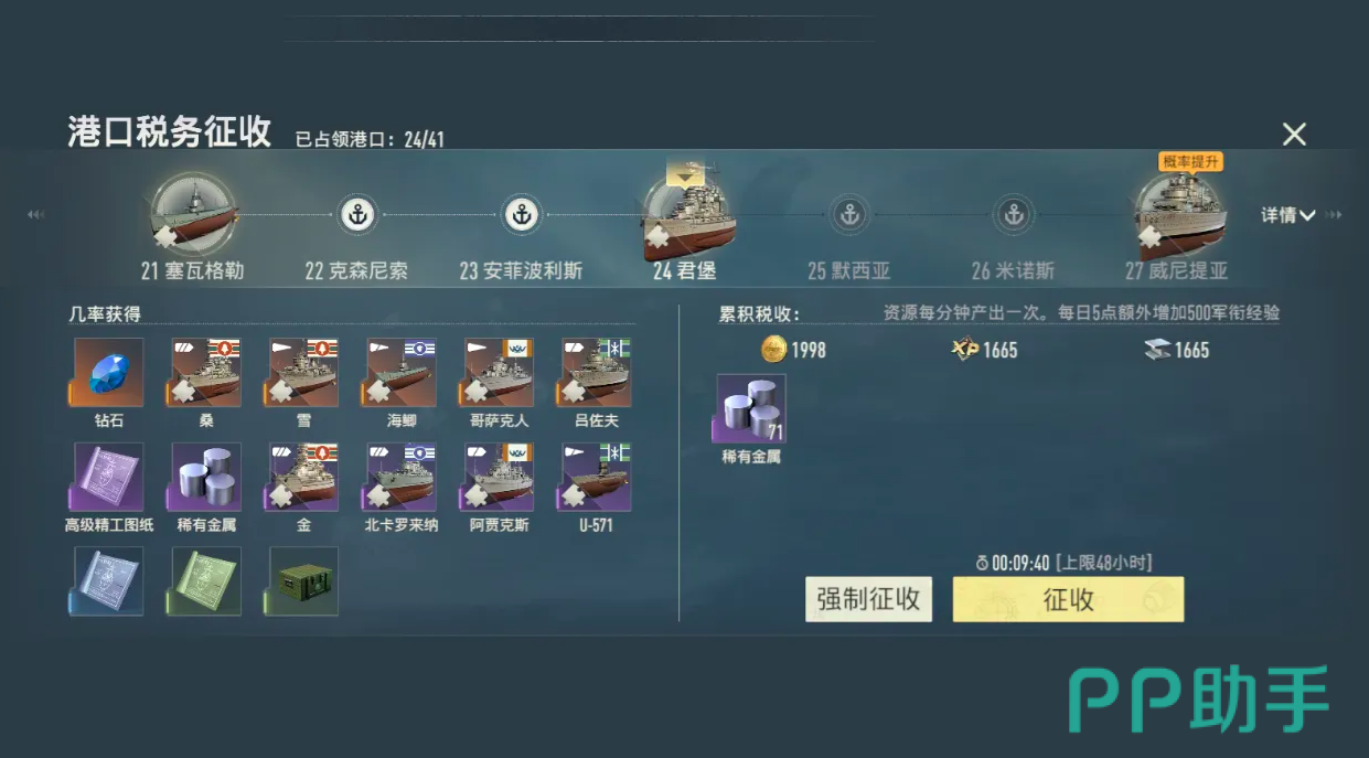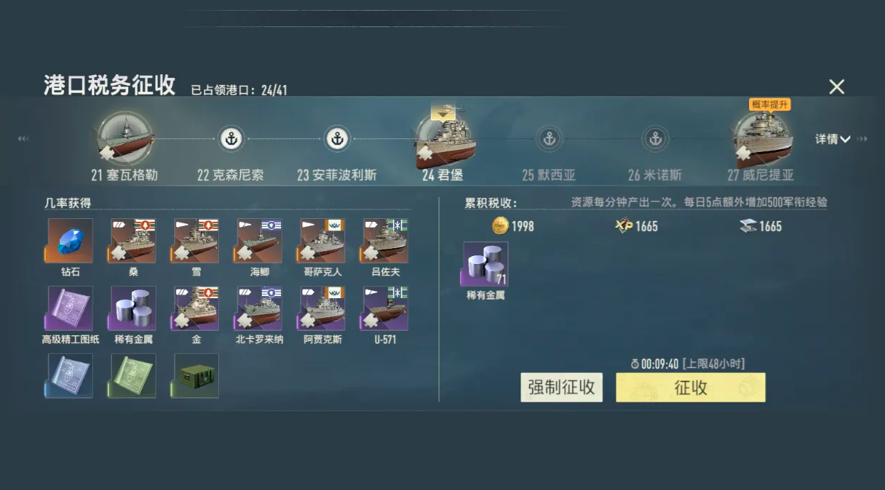 第三大模块就是关于港口税收的内容,它可以说是资源稳定的命脉,玩家对于你这那些已被玩家战略的港口不仅仅是前哨基地,更是玩家持续收益的坚实后盾,这些港口在玩家进入到挂机阶段后依旧会有资源收益,这就是游戏当中的税收,收益构成十分丰富,包括了金币、经验值、稀有金属图纸等一系列内容,而这种税收的最大核心是在于它的规模效应,玩家能够控制的港口越多,那么在单位时间内所收益的税收也就越丰富。