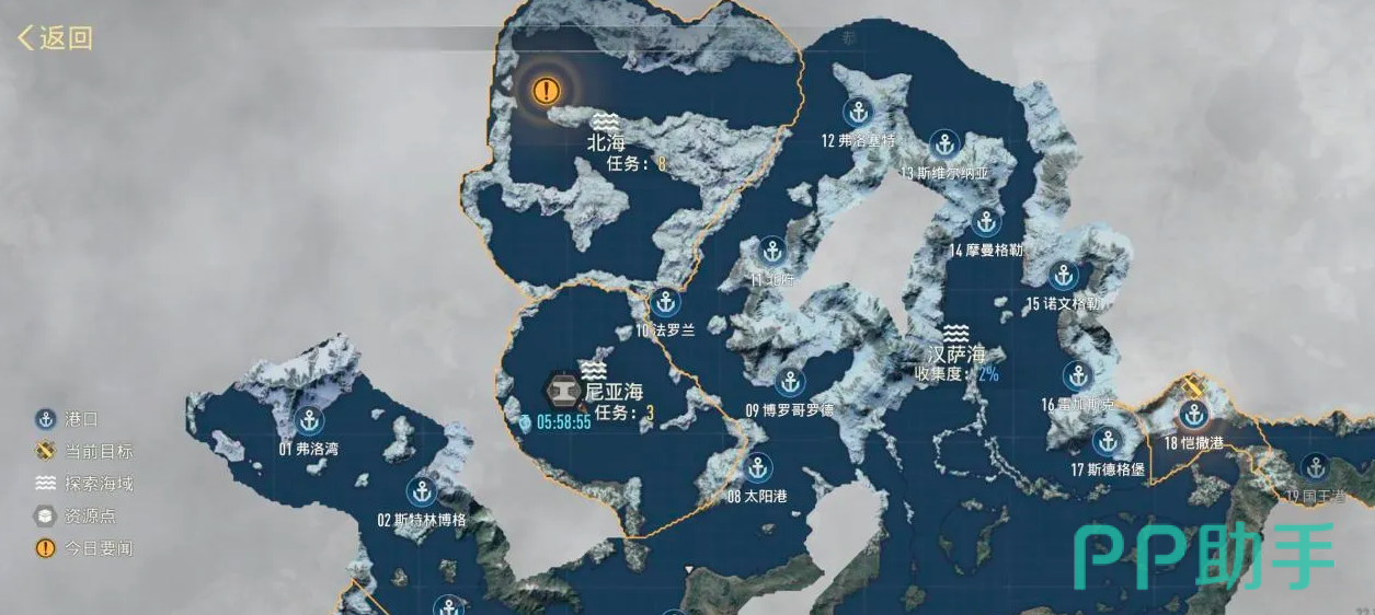 第四大模块,也就是战略模块,在这里玩家可以快速俯视2D战略地图,核对视觉布局情况进行全面了解,玩家已成功占领的港口和未成功占领的港口,以及当前正在攻略的港口,这几个内容能够快速跳转,省去了繁琐的手动寻路时间,极大的提升了执行效率和战略速度。