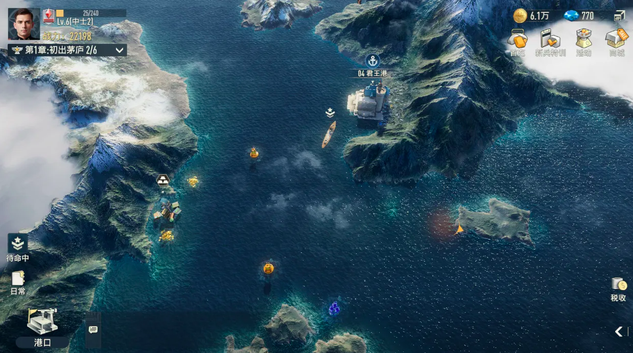 第二部分就是关于近海探索的玩法,在这里可以发现大量的海域宝藏,如金块,铁块以及一些稀有金属,这些稀有金属也是玩家建造舰队的必需品;除了这些还可以获得经验值以及珍贵的图纸、舰船碎片这些关键道具,每一次探索都充满了未知挑战。
