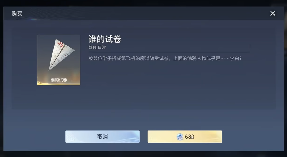 王者荣耀游戏中上线了一款别具一格的载具——纸飞机“叫谁的试卷”。单看名称就充满校园记忆点,自带话题性与代入感,迅速引发玩家关注。该载具为商城限时上架的付费道具,本期将从外观设计、操作表现及视觉特效等维度,全面解析其实际体验。