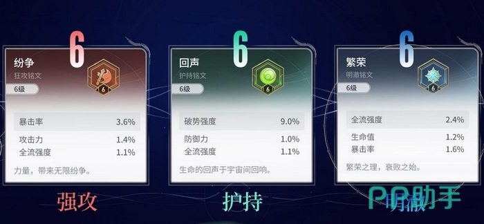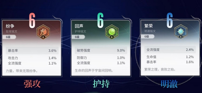 推荐组合:6纷争 + 6回声 + 6繁荣。尽管职业标签为辅助,但实战定位实为输出协作者,铭文构建必须以输出效能为优先。纷争提供暴击率、攻击力与流技强度;回声与繁荣共同强化全流技强度,并附带破势属性,进一步提升对高防御目标的穿透能力。