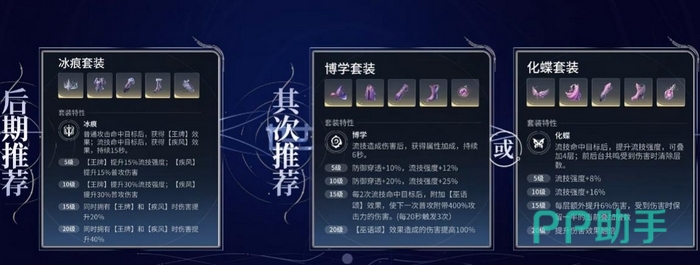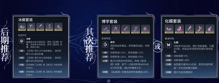 鲁班大师需兼顾输出强度与技能循环效率。前期推荐选用斗士套装,侧重提升攻击力、暴击率及流技强度,加快5号充能速度与单次伤害转化。中后期切换为冰痕套装,该套装在普攻或流技能命中时分别触发不同增益,当两种效果同时存在时,还可额外获得高额复合伤害加成,完美契合其多段技能+高频普攻的输出节奏。博学套装与合化蝶套装亦为可行备选方案,适用于特定配队环境。
