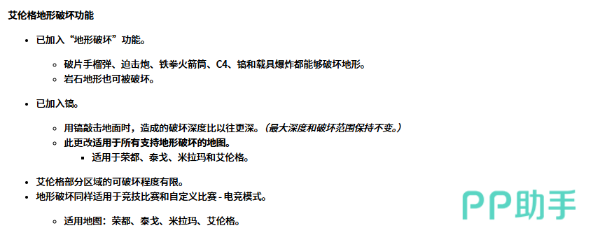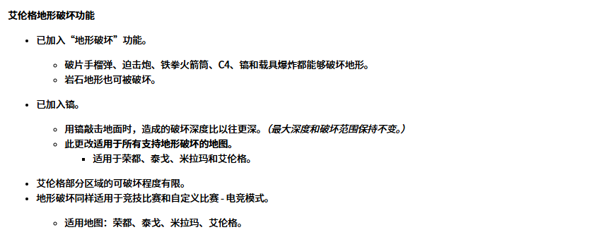 艾伦格、荣都、泰戈及米拉玛四张地图同步实装高精度环境破坏功能。手榴弹、迫击炮及镐类工具均可触发地形变形效果,其中镐具敲击可实现更深层级的地面凿穿(最大破坏深度与作用半径维持不变)。该特性亦支持自定义比赛及电竞模式调用,增强战术掩体构建自由度。