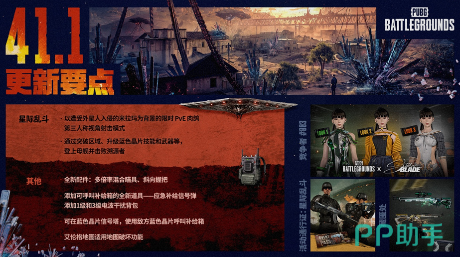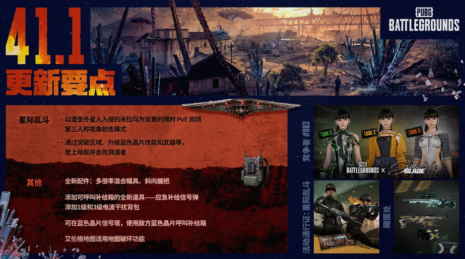 PUBG 41.1版本通过系统性进化,在保留经典生存竞技内核基础上,注入更具策略纵深与操作反馈的新要素。从星际乱斗的叙事化PVE尝试,到地形破坏带来的掩体博弈升级,再到枪械配件与补给机制的精准调控,每一处改动均指向更富张力的战术演进空间。建议玩家结合自身打法习惯,针对性熟悉新配件适配逻辑、新模式资源分配节奏及地图轮换应对策略,以最大化版本红利。同步关注《剑星》联动内容,解锁伊芙角色专属表现形式。