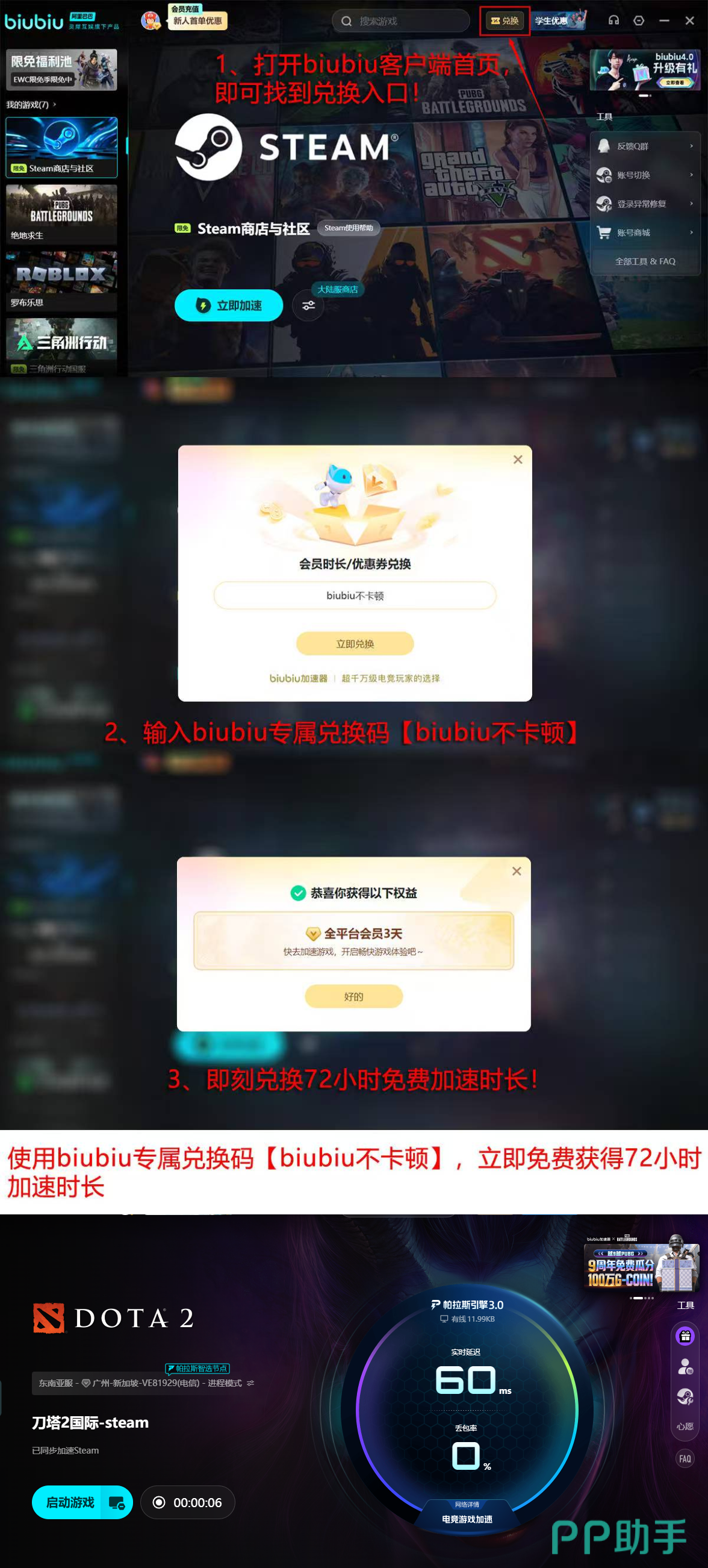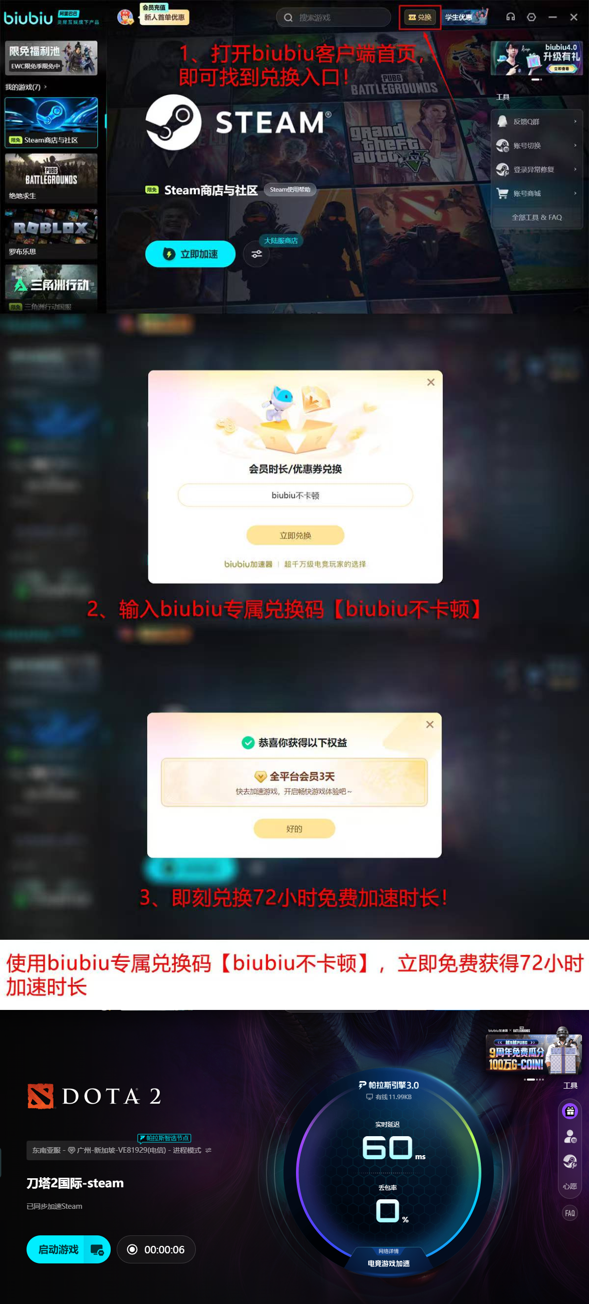 现面向新用户提供双重体验权益:完成biubiu账号注册后,系统自动发放24小时全功能免费加速时长;在此基础上,于客户端兑换码栏输入【biubiu不卡顿】,即可额外激活72小时加速权限。两项叠加总计96小时,覆盖约4天连续使用周期,足以完成多局天梯对战及自定义房间联机测试,全面评估其对Dota2闪退问题的实际干预效果。