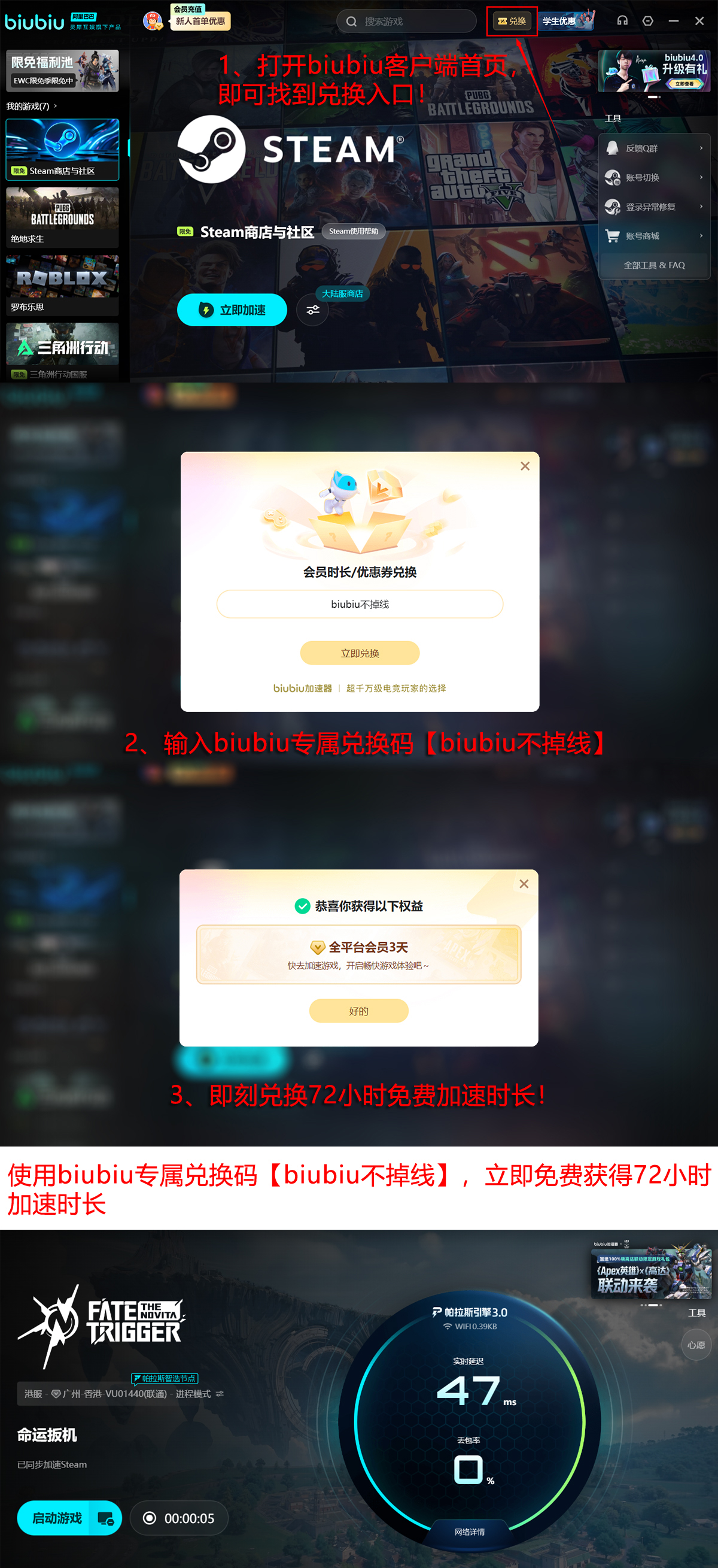 该加速器已通过职业电竞场景验证,与知名冠军选手XDD小叮当达成技术合作,印证其在高强度对抗中的可靠性。新用户注册即可获赠24小时免费加速时长;另在官网首页输入激活码【biubiu不掉线】,还可额外领取72小时权益,累计达四整天无限制使用,全程无需支付费用。