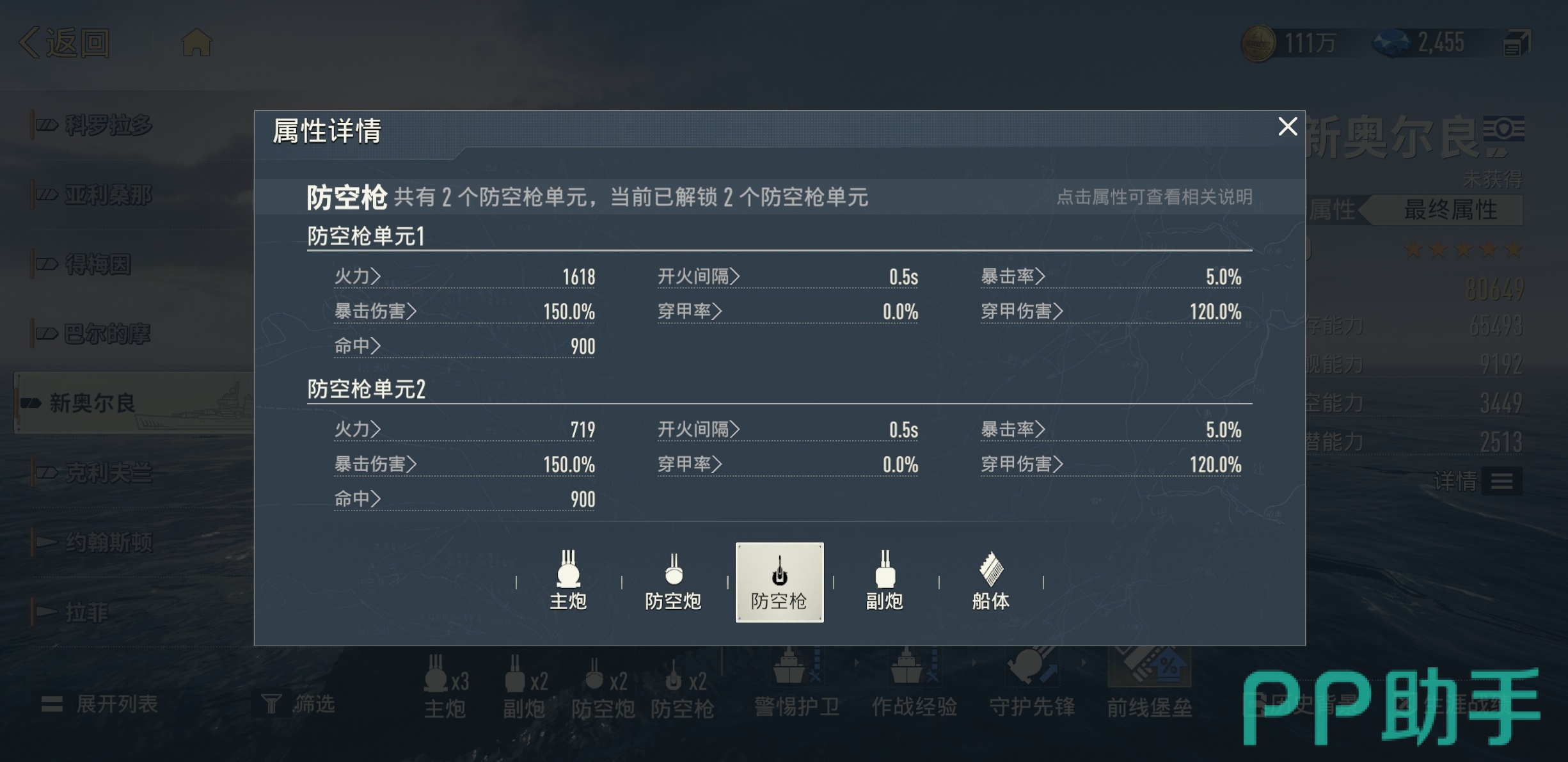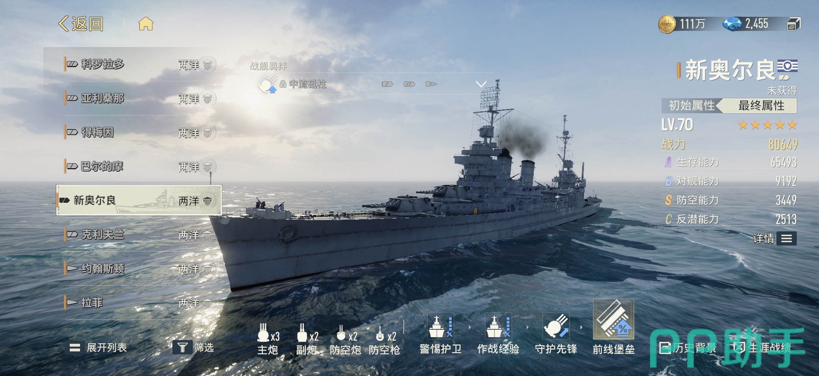 从战斗定位来看,新奥尔良的核心价值集中于防空体系构建。其搭载两座专用防空炮与两座防空机枪,形成覆盖范围广、反应速度快的立体拦截网,能高效应对敌方鱼雷攻击机与俯冲轰炸机编队,是团队防空链路中的关键节点。生存维度表现稳健:基础耐久值处于同阶巡洋舰前列;具备“临时装甲”机制——每当前方友方舰载机完成四次出击后,自动为自身附加护甲增益;同时拥有主动修复能力——当耐久首次跌破30%阈值时立即触发一次即时修复,并在此后每10秒持续恢复一次。相较而言,其反潜作战效能相对薄弱,对舰输出能力属于巡洋舰常规水平,略低于战列舰单位。