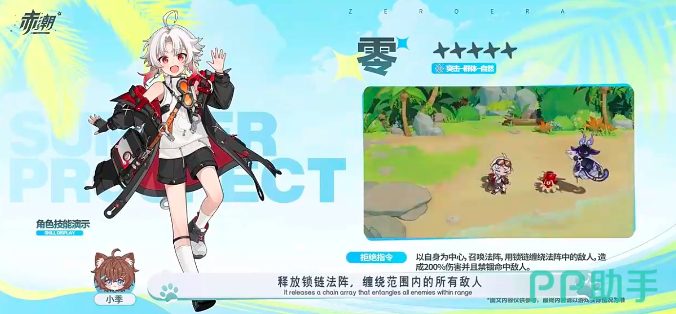 零——代号“侵蚀指令”的战术执行者,SSS五星评级。其一技能为三段式锁链打击,前两段造成物理伤害并削减目标防御,第三段命中时触发“侵蚀”状态,使目标在3秒内受到额外真实伤害,且该效果可叠加。大招“拒绝指令”为范围压制型技能:以自身为中心展开法阵,对半径4米内所有敌方单位施加持续2秒的禁锢,并伴随多段能量脉冲伤害。该技能冷却时间18秒,是团战先手与反打的关键枢纽。