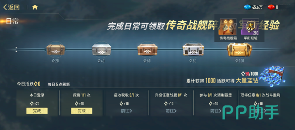 第四类常规获取方式为每日活跃度系统。完成全部日常任务后,玩家活跃度将累计至100点,随即开启战舰碎片宝箱。该宝箱每日可领取一次,内含多档位碎片、军衔经验及稀有资源,长期坚持可有效补充主力舰培养所需材料,亦是获取传奇舰船碎片的高频渠道之一。