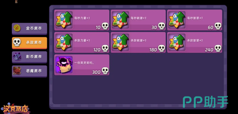 裂隙内设独立黑市界面,支持使用金币、击杀数、影币、恶魔之心四类资源兑换不同功能道具:金币用于强化装备,击杀数兑换属性成长,影币购买法术书,恶魔之心换取稀有宝物。其中影币可通过影币挑战或强化三选一玩法获取;恶魔之心需通关恶魔挑战副本获得。