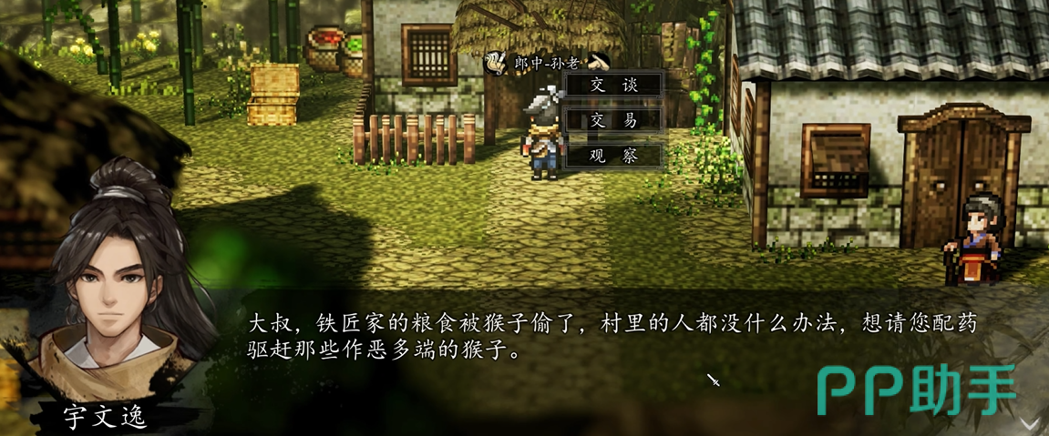 任务起点位于村庄铁匠铺。与铁匠对话后,玩家得知一只野生猴子频繁闯入民居、损毁器物,引发村民集体困扰。铁匠委托玩家协助处理此事。随后需前往郎中处领取一瓶特制药剂,据称可有效驱离或制服该猴。携药进入指定树林区域,即可定位目标猴子并触发关键交互节点。