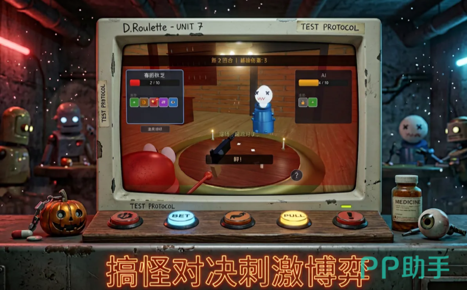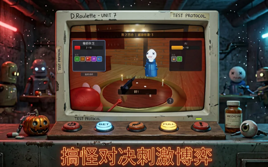 不同于传统策略类游戏侧重于宏观战术布局,《恶魔轮盘》聚焦于高度浓缩的心理对抗与即时决策张力。本作以经典俄罗斯轮盘为底层机制,融合第一人称视角、卡通化机器人角色与圆桌对峙场景,构建出节奏紧凑、悬念迭起的双人博弈体验。玩家需在有限信息下预判弹药分布,结合概率推演与道具协同,实现以弱胜强的翻盘可能。