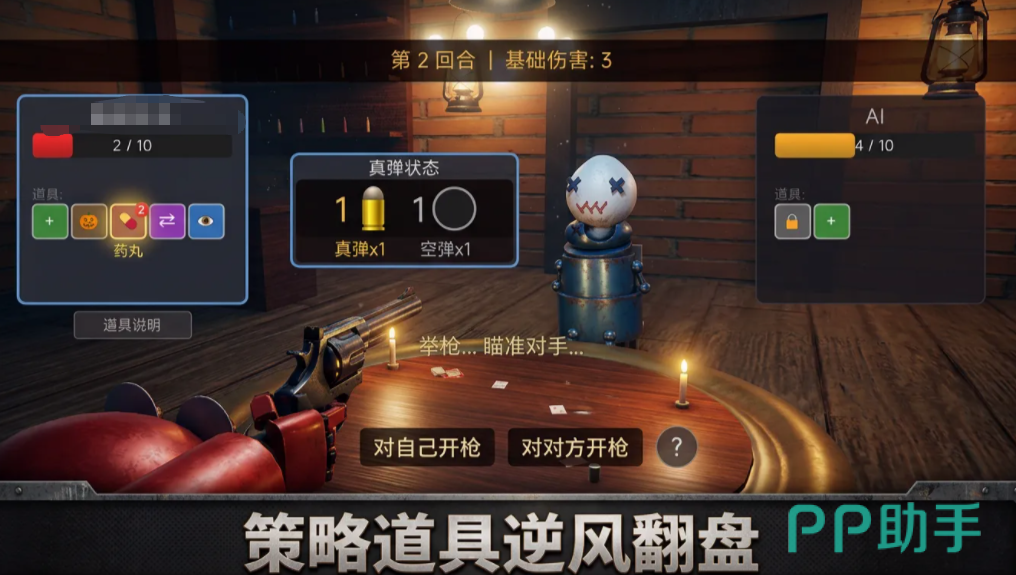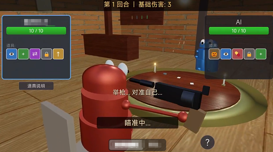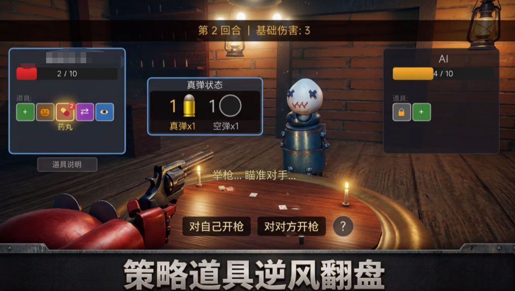 游戏采用关卡递进式成长设计:首关仅开放基础规则,无道具介入;自第二关起,角色生命值提升至4点,并在每回合开始时随机分配两个功能型道具。全游戏共设七种道具,涵盖弹药探测、射击方向干预、行动权重置等维度,要求玩家在动态变化的局势中持续优化资源分配策略,在压制对手血量的同时严守生存底线。
