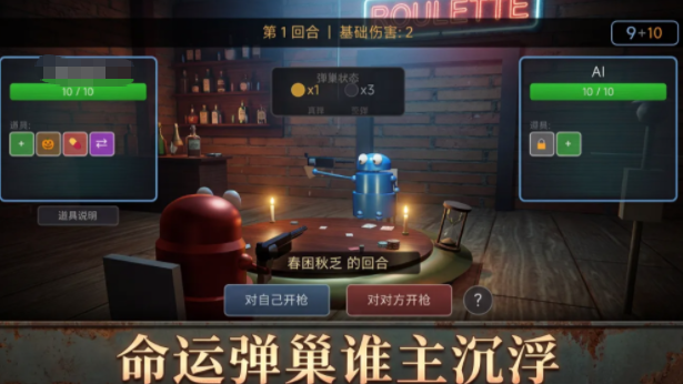 进入挑战后,双方以机器人形象对坐于圆形竞技场中央,初始生命值均为2点,其中一方被随机指定为“恶魔”,负责在六发霰弹枪中装填实弹与空包弹,并向对手公开当前弹药总数。随后由玩家率先行动:可选择朝自身或对手开枪。若朝自己射击且触发空包弹,则额外获得一次行动机会;若为实弹,则损失1点生命值;若朝对手射击,实弹命中将削减其1点生命值,空包弹则无效果并移交行动权。整个过程强调信息不对称下的心理施压与行为反制。