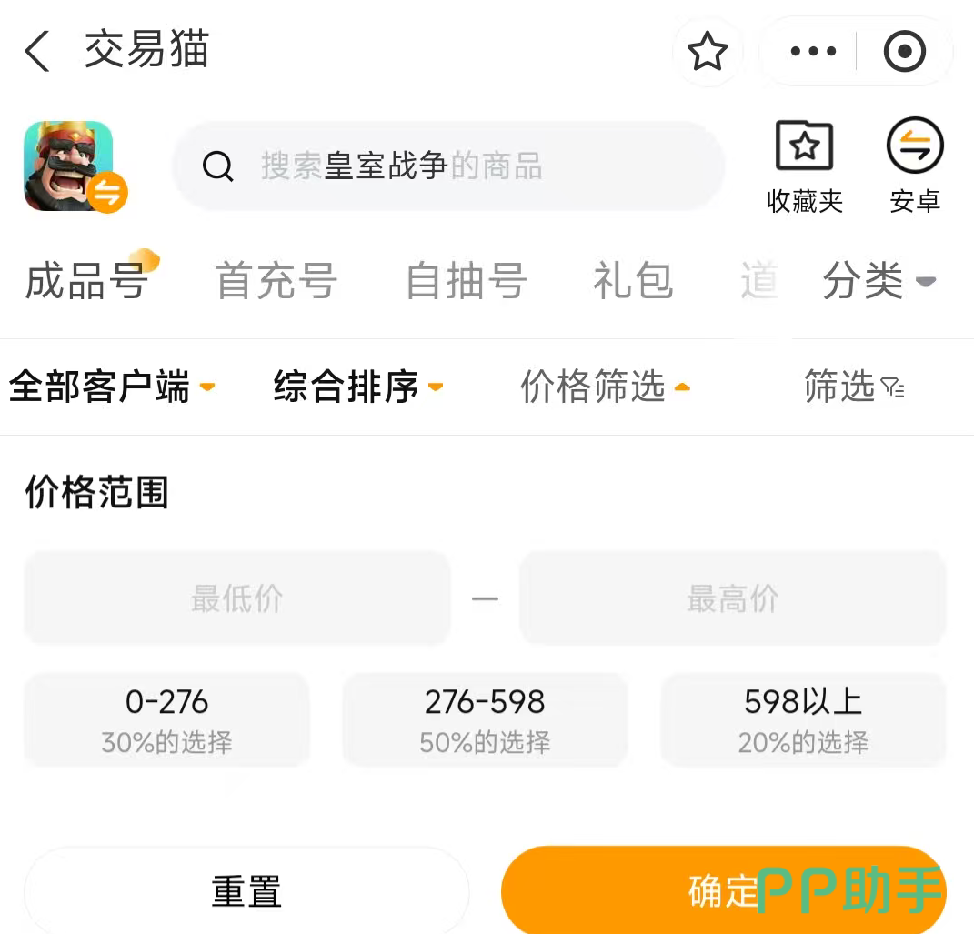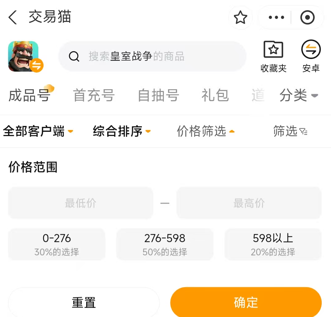 预算有限的玩家常面临筛选效率低、比价耗时久的困扰。交易猫内置智能价格区间过滤系统,支持按金币总量、传奇卡数量、最高杯数、法术等级等维度设定阈值,系统自动聚合匹配结果,大幅压缩人工筛选时间,帮助用户在合理价位内精准锁定高性价比皇室战争账号。