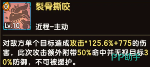 主动技“裂骨撕咬”具备高穿透特性:对指定敌方单位造成基础伤害,额外附加50%命中率,并无视目标30%防御值。被动技能“不灭骸骨”提供双重生存保障——免疫中毒、流血、灼烧等所有持续性伤害类型;阵亡时100%触发重生,同时恢复自身最大生命值50%的血量。