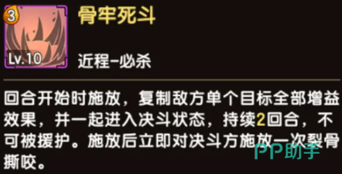 其核心必杀技“骨牢死斗”于回合起始自动触发,限定每场战斗仅可发动一次。该技能会精准复制敌方单体目标当前全部增益状态,并强制双方进入持续2回合的决斗状态。决斗开启瞬间,立即对目标施放一次“裂骨撕咬”。在此状态下,仅决斗双方可进行普通攻击,其余单位既无法对其造成伤害,亦不可施加任何控制或状态效果。