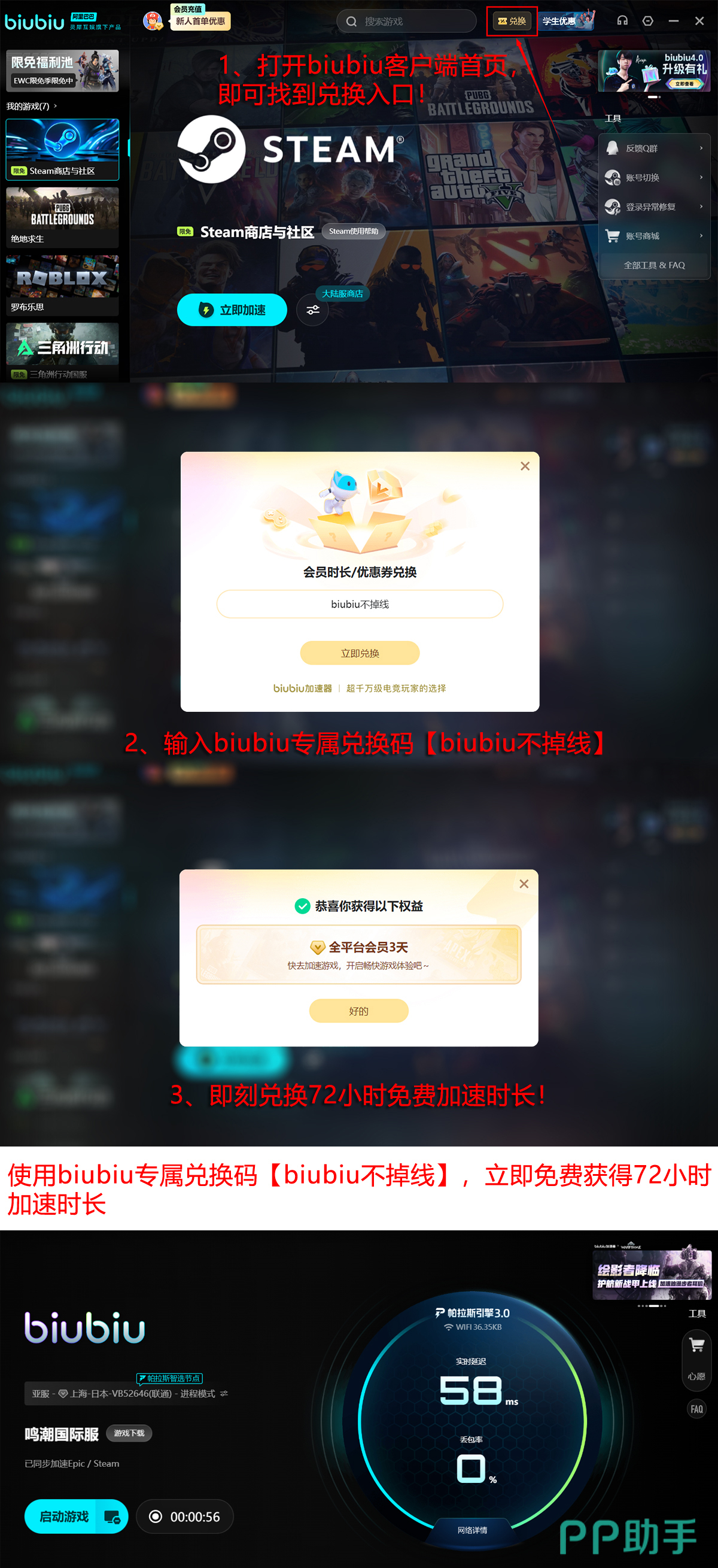 针对新用户,biubiu加速器同步推出限时福利:注册即赠24小时全功能免费加速时长;参与活动还可兑换“biubiu不掉线”权益,额外获得72小时服务时长。两项叠加后,新用户最高可享累计96小时无门槛加速体验,充分覆盖《鸣潮》完整下载、安装及初期体验周期。