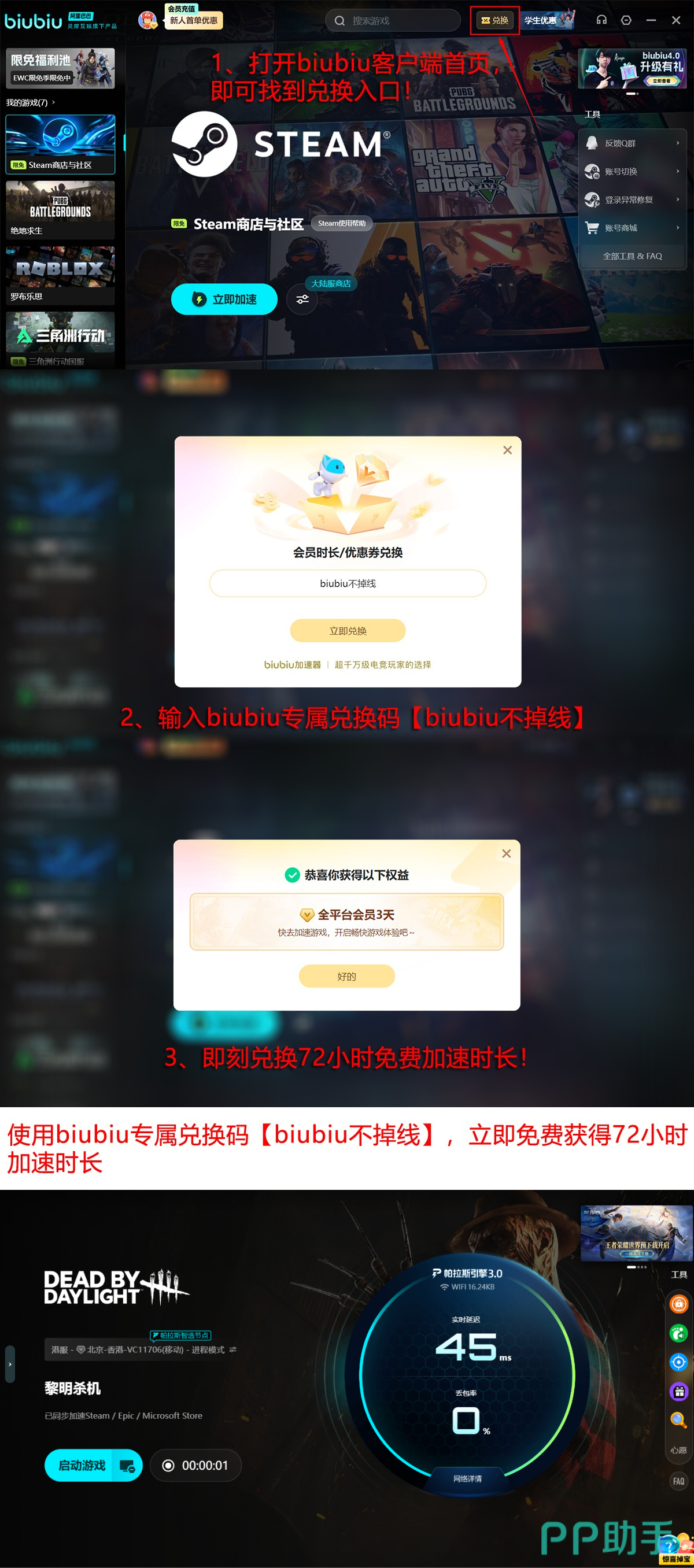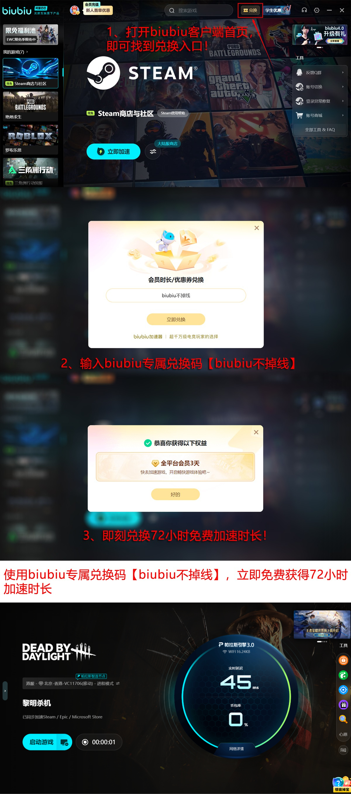 新用户完成注册后,即可立即获得24小时全功能免费试用权限;输入激活码【biubiu不掉线】还可额外领取72小时加速时长。两项权益叠加,首期可享总计96小时无限制高品质加速服务。
