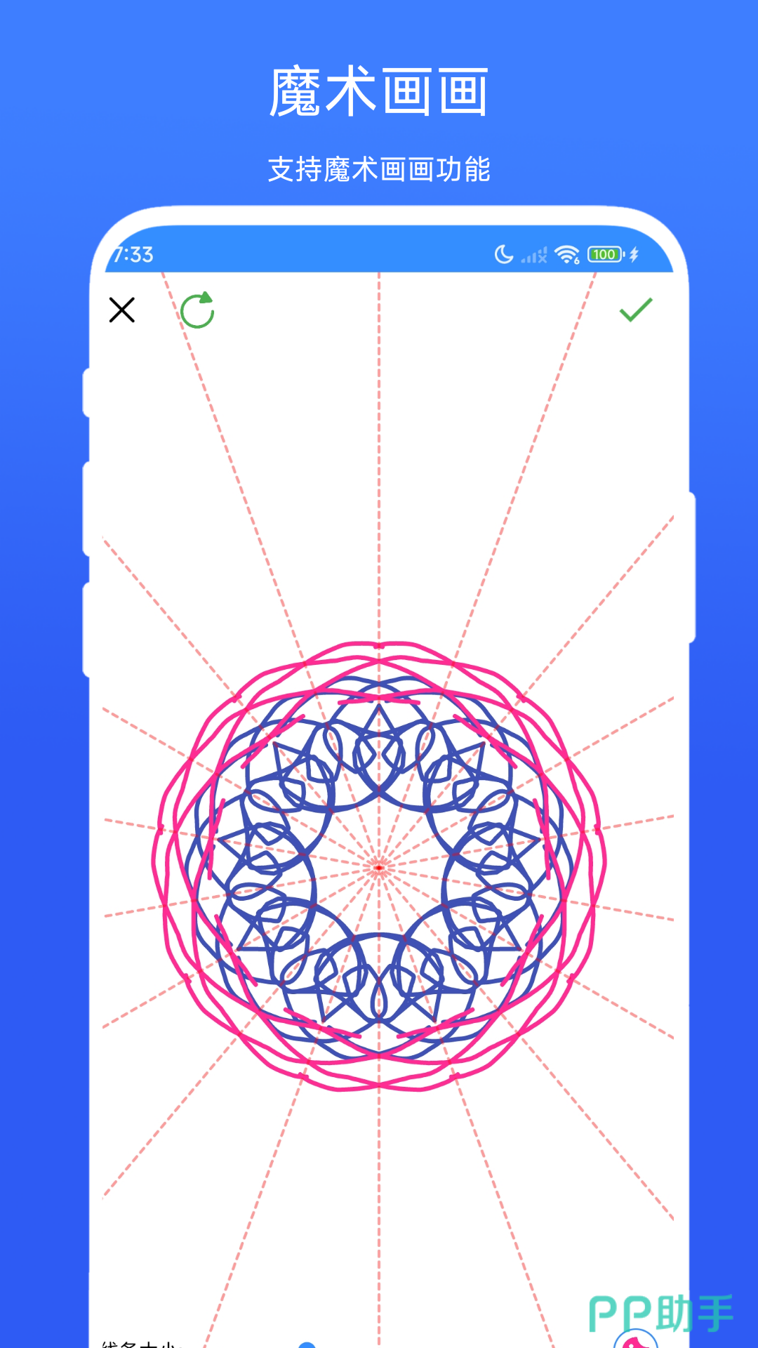 专治对称构图难题——内置多轴对称模式(水平/垂直/径向/旋转),支持自定义对称线数量与角度;图形辅助工具可一键生成标准三角形、正圆形、矩形等基础形状,并实时显示尺寸参数与坐标参考线。手绘稳定性优化出色,线条延迟低,适合练习结构与比例把控。