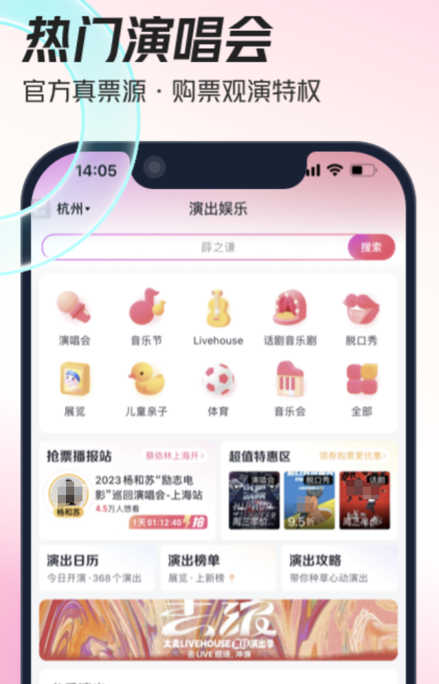 专注中小型现场音乐演出多年,合作场馆遍布全国超千个Livehouse,涵盖摇滚、民谣、电子、嘻哈等多种风格。不仅覆盖头部独立音乐人巡演,也持续支持新兴乐队与地下厂牌活动。资讯更新及时,购票后即时生成加密电子票,扫码快速入场;大型演出还提供实体票邮寄服务。平台内建观演社群,便于乐迷自发组队、交换信息;“发现”频道可按地理位置推荐周边演出场所及兴趣匹配的观众群体。