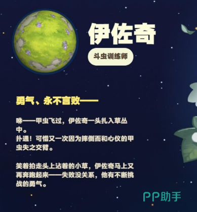 他的性格中也会藏着一些执着和勇气,独具标志性的行为,那就是一直追逐昆虫。每当甲虫飞过之后,它总是会直接扎进草丛中,不会有任何的犹豫。但却因为奔跑而摔倒,最终和喜欢的昆虫失之交臂。即便如此,也并没有沮丧,只是笑着将头上的小草拍掉,然后又立刻爬起来追逐,还会元气满满的说道,没关系,这次没抓到,下次就会有惊喜。这一种永不言败的精神,也会感染着每一个不一样的玩家。