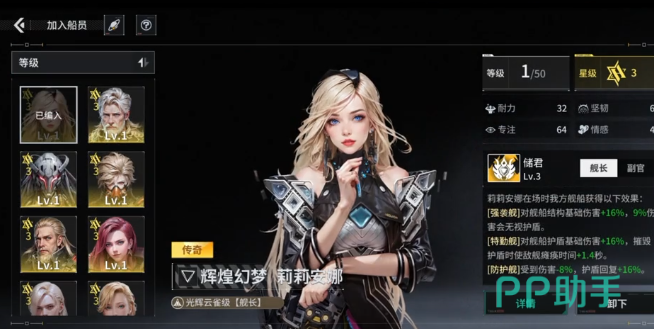 属性成长方面,他也完全是天花板一样的级别,1级初始有32个耐力,64个专注,43个情感。在提升到50级之后,那么属性也会迅速的飙升,不管是输出还是辅助属性都是足够使用的,没有任何的短板。作为一个三星的传奇船员,养成的上限是比较高的,后期在拉满之后,属性就可以直接碾压同级别的船舰。不管是前期开荒还是后期毕业,都是可以一直用的,完全不需要担心会淘汰。很多的人可能会觉得疑惑,不知道应该如何去搭配,其实他就是最强的奶妈,可以让队伍肉到完全打不动。怕你是混搭的阵容,他也可以完全的适应,所以根本就无需担心。