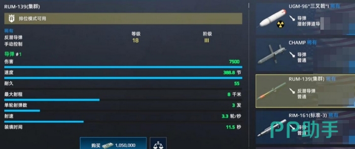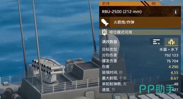 中阶玩家可优先考虑鱼8反潜导弹。其飞行轨迹与Y21接近,中速巡航兼顾机动性与稳定性,单发弹体耐久值更高,在穿越敌方近防系统与电子干扰带时生存能力更强,因而实际命中率与伤害兑现率更为可靠。若已积累充足资源并追求顶级反潜效能,则RBU-2500为当前版本公认的最优解:不仅拥有全游戏最广AOE覆盖半径,更具备主动拦截鱼雷及引爆来袭导弹弹幕的双重防御功能,真正实现攻防一体。