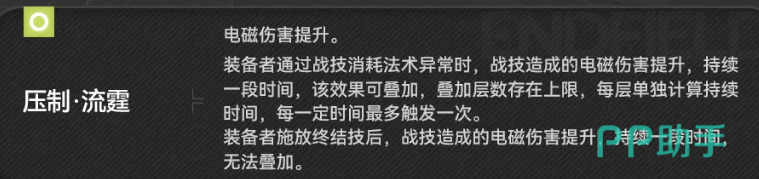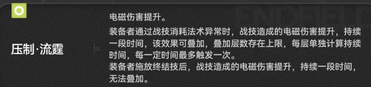 当装备者通过战技消耗法术异常状态时,将触发“压制流霆”的增益效果:战技所造成的电磁伤害提升,持续时间独立计算;该效果支持多层叠加,但存在层数上限;同一单位每固定周期内仅可触发一次,避免机制滥用。