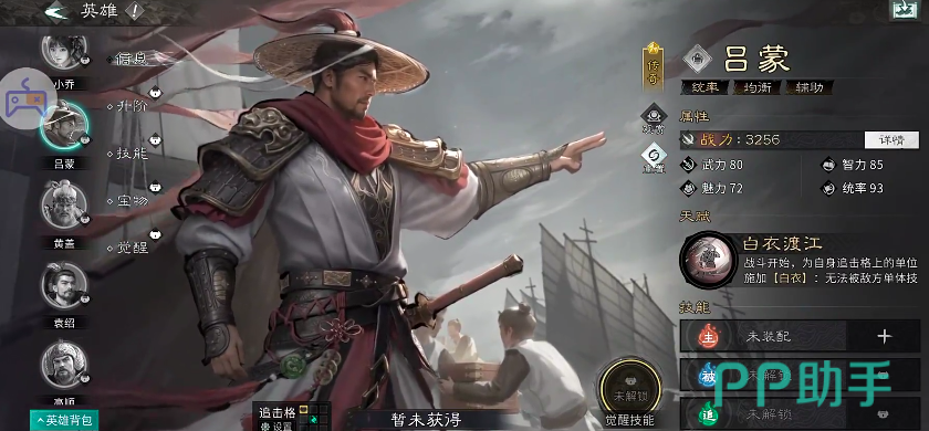 第三位是吕蒙——节奏型增益辅助。其定位聚焦于战斗初期的稳定性构建。天赋效果于首回合即激活,被动为处于追击格的友军附加“白衣”状态,生成隐身护盾,全程无需手动操作。该机制既能缓解前期承伤压力,亦可在中期控场阶段保障关键武将持续输出。对于缺乏生存保障的脆皮阵容而言,吕蒙是性价比极高的前中期过渡及长期驻场选择。