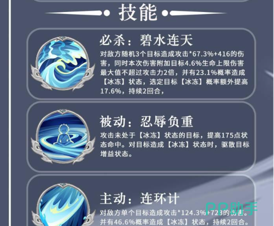 必杀技【碧水连天】是陆逊打出团控节奏的关键。该技能可对敌方三名随机目标造成伤害,并附加基于目标最大生命值的额外伤害。更重要的是,它自带基础冰冻概率,且当玩家手动指定目标时,该目标冰冻触发率显著提升,并可持续两回合。实战中常出现单次释放即同时冻结两名敌方主力的情形,直接打断对方技能链,尤其在对抗孙权、周瑜等依赖连续技释放的阵容时,压制效果极为突出。群体冰冻亦能有效缓解我方承伤压力,为后排输出争取关键的启动窗口。