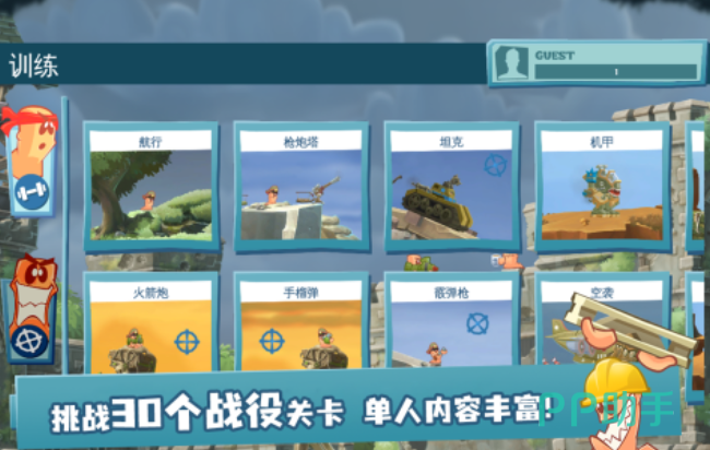 游戏设计注重教学引导与渐进式挑战,内置十关结构化训练模式,涵盖20项动态递增的任务目标,各关卡在地形复杂度、资源分布与敌方AI行为逻辑上均存在差异化设定。玩家需结合实时环境要素(如坡度、掩体、风向)与手中武器特性(如弹道曲线、爆炸范围、延迟引信),灵活构建战术路径。例如利用石驴载具实施地形压制,或通过神圣手雷触发连锁爆破,每一个微操决策都将直接影响战局走向。胜利时刻带来的并非单纯成就感,而是策略落地后自然涌现的沉浸式愉悦感。