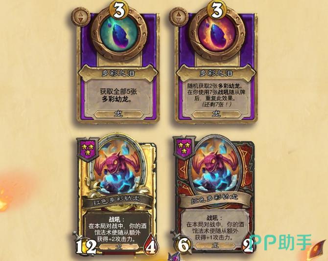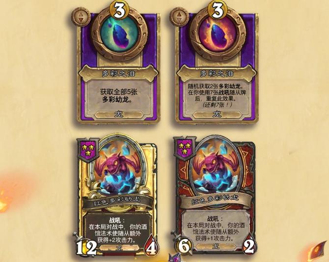 龙族阵营同步引入“多彩幼龙”系统,共设5种类型,功能覆盖法术伤害加成、攻击力与生命值强化、龙族专属攻血增益,以及随机获得一张消耗2枚铸币的酒馆法术卡牌。相关饰品如“多彩之泪”亦已实装,为龙系构筑提供更多协同空间。