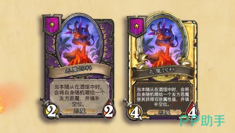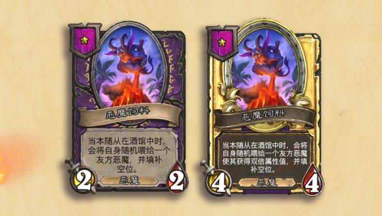 恶魔体系迎来全新互动逻辑:“恶魔饲料”机制加入酒馆刷新池,该元素一旦出现即被当场吞噬。新增恶魔随从如二本卡“恶魔实验助理”,其战吼效果可在接下来的三次酒馆刷新中分别生成一份恶魔饲料;配合特定饰品(如亵渎者肖像),还可进一步提升饲料所转化随从的基础属性。