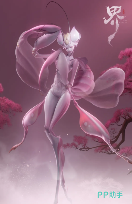 九畹螳娘——山野精魅谱系中的雌性螳螂化形者。外观以柔粉为主色调,姿态轻盈婉约,然其本质恪守“兰香引诱、镰刃断生”的古老捕食法则。她以兰香凝露为媒介惑人心神,凡被香气所摄之异性,顷刻遭双镰斩杀,躯壳转为自身续命资粮。此设定完全贴合“螳螂捕蝉”类志怪原型,未增删核心行为逻辑。