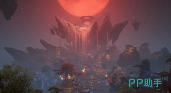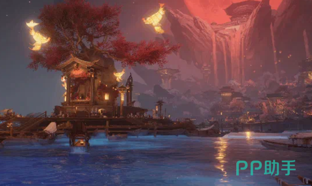 叱罗诡市是整部作品中最具标志性的空间节点,隶属妖界疆域,以双月奇观为视觉锚点——赤月高悬,映照出诡谲幽深的氛围基调;素月静浮,勾勒出虚实交织的边界感。整个区域划分为三大立体层级:悬浮于夜空之上的月下叱罗、铺展于大地之上的平原市集,以及沉潜于水下的隐秘领域。玩家需借助特定交互道具实现跨层通行,在红白双月交替映照下穿行于明暗交界之间。场景设计刻意融合繁盛与凋敝的意象对照,如朱漆雕栏旁垂落枯藤,喧闹摊肆边伫立残碑,以此强化中式奇谭特有的张力美学。