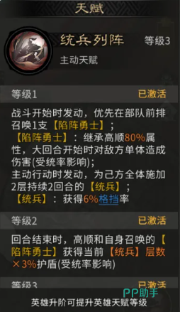 高顺承担体系承伤与增益双重职能:其主动技能可提升全体友军统兵效率,并增加格挡概率,有效延长召唤单位及本体存活时间;觉醒技更赋予召唤物额外行动概率,实现“召唤物再召唤”的滚雪球效应。三者协同下,首回合即可完成武将行动+召唤物行动的双动链,抢占先手输出窗口,形成显著节奏优势。
