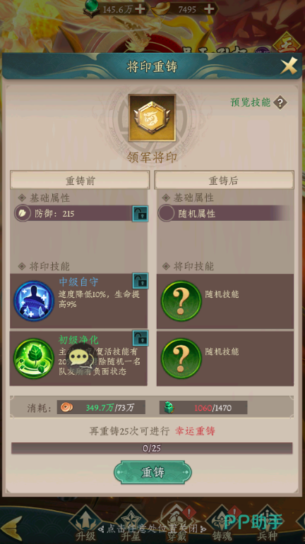 铜钱与玉玺是贯穿前期发展的两大核心资源。玉玺广泛用于商城兑换时装、战法、勋章等关键内容;铜钱与玉玺共同构成将印重铸系统的消耗基础。该系统能直接突破武将基础战力上限,对新手战力跃升具有决定性作用,务必重视日常积累。