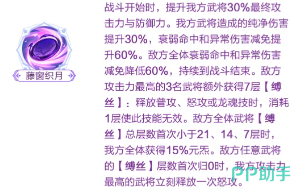 进入战斗后,我方攻击力排名前三的武将将自动获得“牵线”状态。该状态下,每次攻击命中均可为目标附加1层“织线”。当我方首次成功击杀敌方单位时,全队将获得10%元炁,且所有龙魂系武将额外恢复2点龙魂值。此外,我方攻击力最高的武将在前3回合内免疫斩杀效果;在其首次释放怒攻或龙魂技后,还将回复20点命魂值。