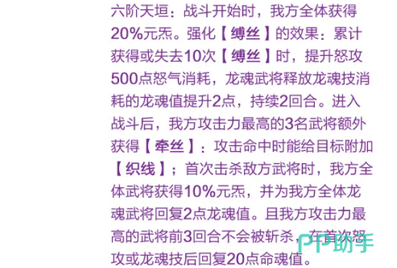 若任意敌方武将身上的“缚丝”层数首次归零,则由我方攻击力最高的武将立即发动一次额外怒攻。其六阶天垣效果可在战斗开始时为我方全体赋予20%元炁,并进一步强化“缚丝”的压制效能:每当我方累计获得或失去10次“缚丝”层数(含叠加与移除),便会触发一次机制——怒攻怒气消耗提升500点,且龙魂值消耗额外+2点,该效果持续2回合。