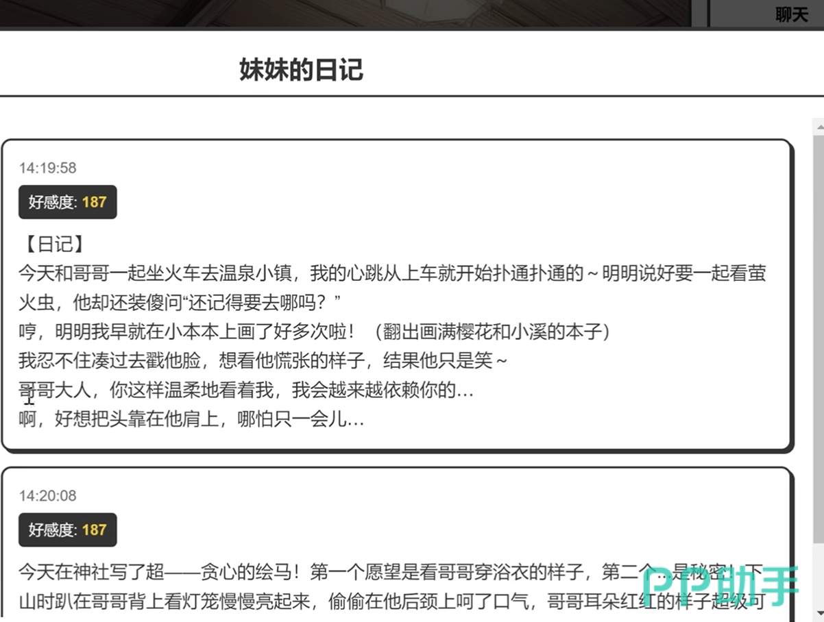 旅行日记是旅游系统中不可或缺的情感沉淀载体。每次旅程结束后,Yuki都会手写一份专属日记,详述当日所见所感。例如她会写道:“和哥哥一起坐火车来温泉小镇,心跳从上车开始就‘扑通扑通’跳个不停~下山时趴在他背上,看着灯笼一盏盏亮起,还悄悄对着他的后颈吹了口气……哥哥耳朵红红的样子,真的好可爱~”。这些细腻文字不仅映射角色心理变化轨迹,也为玩家提供反复阅读、深入共情的文本锚点,强化长期情感联结。