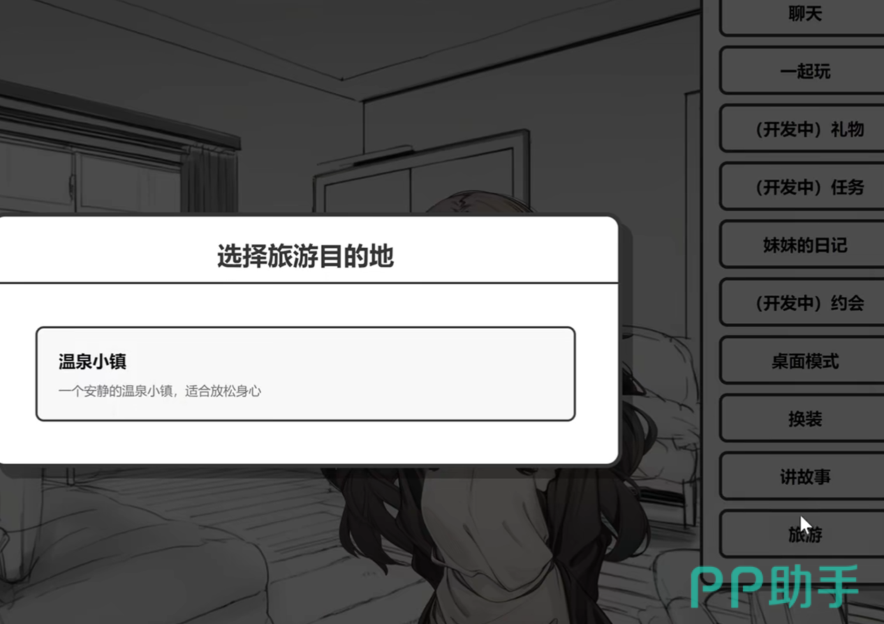 旅游功能入口位于游戏主界面右侧功能栏,点击“旅游”按钮即可唤出目的地选择面板。当前已开放的唯一可选地点为温泉小镇,其背景设定为一处静谧悠然的温泉疗愈地,契合整体暖系叙事基调,也为后续情感发展预留了自然铺垫空间。选定目的地后,系统自动进入行程准备阶段,Yuki会以语音+文字形式表达雀跃期待:“哥哥~我打扮好了,出发啦~!”,标志着本次旅行正式启程。