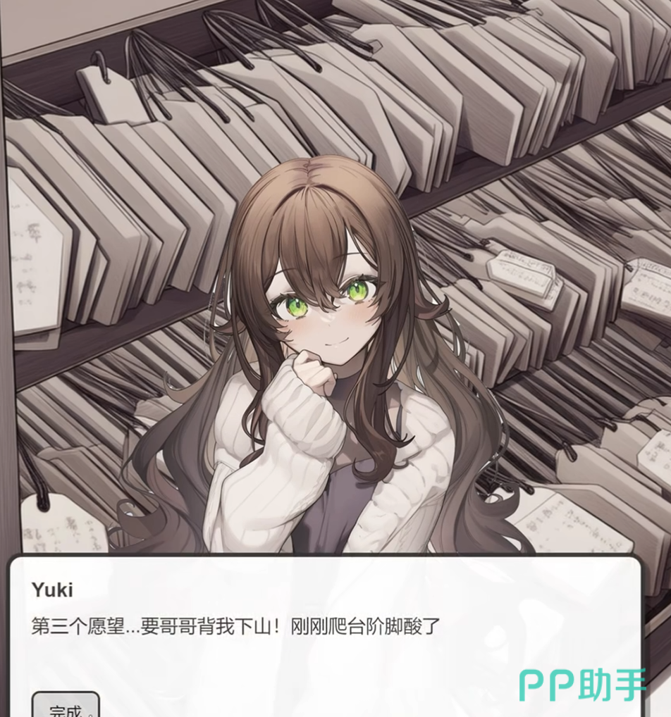 抵达温泉小镇后,玩家将开启自由探索模式。在神社区域,Yuki会提出三项许愿请求,其中第三项为“哥哥背着我下山!刚刚爬完台阶脚就酸了”。该任务既还原真实生活细节,又明确指引操作方向,使观光行为转化为具象化目标驱动型互动。完成此类轻量级动作任务后,不仅可即时获得成就感反馈,还会在Yuki的旅行日记中生成对应记录,形成“行为—反馈—回溯”的完整情感回路。