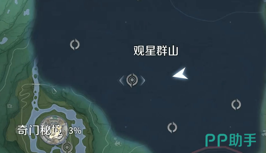 该地下入口位于观星群山地图中已标出的位置(见上图)。抵达洞口后,需使用普通攻击依次激活左右两侧的机关装置,方可解除封印、开启通道。进入后可直接从洞口纵身跃下至底层空间;途中所见中央石门为静态布景,不具备交互功能,无需尝试开启。