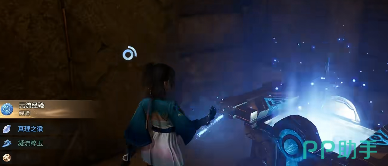 落地后可见四枚可拾取球体及一个中央机关台。务必先收集全部球体,随后启动机关,持球依次击打对面四个金属盘。完成一轮完整命中后,中央巨型石门将自动开启,门后藏有一个宝箱。需注意:密室同步触发注水机制,水面将逐步上升。