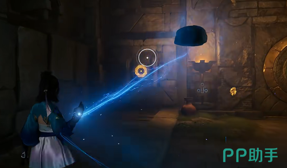 操作策略如下:先同步开启三个圆盘开关,启动机关令小球升至中段并卡停;随后关闭中间圆盘,使小球受重力作用滑落至左侧宝箱位置,完成最终解锁。开启宝箱获取全部资源后,使用钩索锚定宝箱顶部结构,即可安全撤离密室。